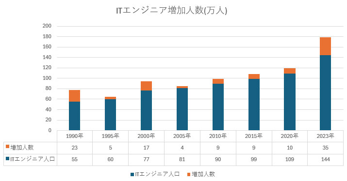 これを引用することで、多くの情報サイトやYoutuber(特定のURLへ誘導するアフィリエイトビジネス)やエンジニア育成サービス業者が未経験者に対しエンジニアを目指すことのメリットを説いており、コロナ禍による他業種の業績悪化もこれを後押ししたことで、2000年から5年ごとに平均13%(9.8万人増)であった増加率が2020年からは3年間で32%(35万人増)となりました。